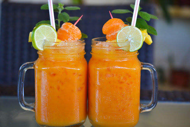 - In a blender combine the mango, pineapple, orange juice, ginger, watermelon and tangerine zest